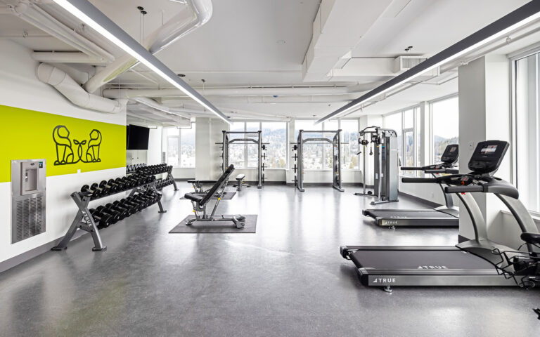 - A fully-equipped gym with state-of-the-art equipment that includes free weights, cardio machines – including Peloton bikes – and a stretching/yoga area