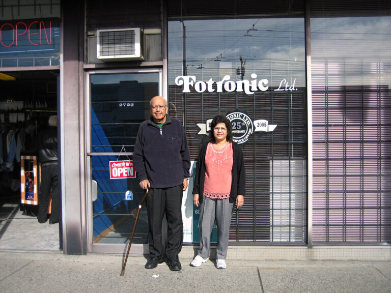 The aging commercial structure that once occupied the site at 2735 E Hastings St was home to many local businesses, including Fotronic, a Canon print and camera service store that was locally owned and operated from 1980 to 2007. Prior to demolition, granddaughter of Fotronic founders, Jazmine Khan (pictured above) reached out to see if we could provide the business’ old address numbers for the family to keep, and we were happy to have the opportunity to assist her in salvaging this important piece of family history! This family business was started by her grandfather, Abu, after immigrating to Canada from Fiji, and was visited over the years by several well-known patrons.