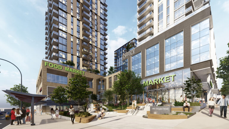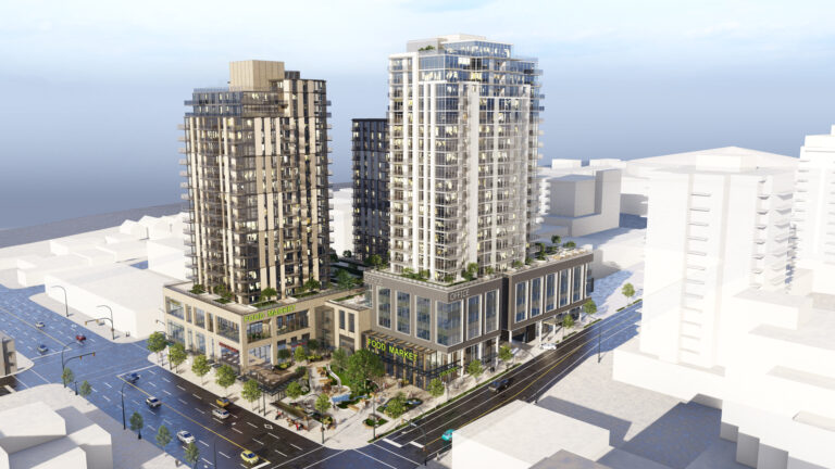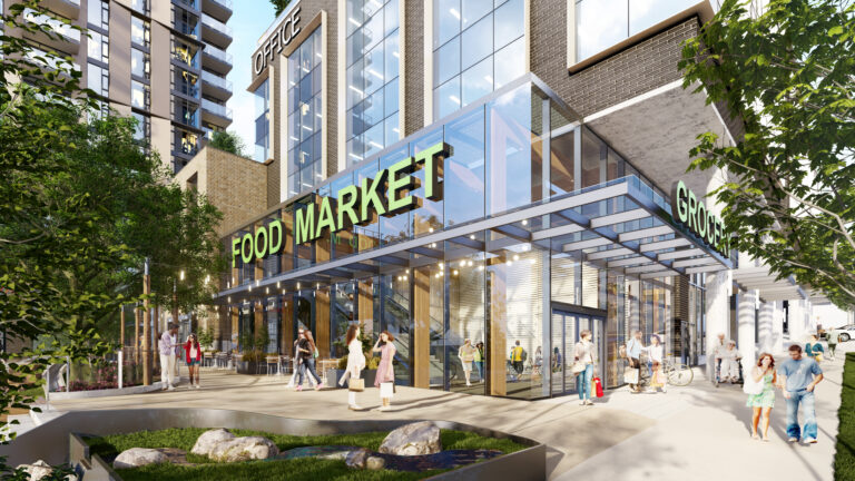 This community will be anchored by a central podium featuring a large full-service grocery store, shops, a community childcare facility, and an open outdoor public space.